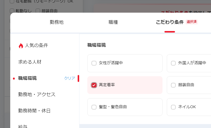 たとえばリクナビNEXTの求人案件検索には、こだわり条件の中に「高定着率」というものがあります。